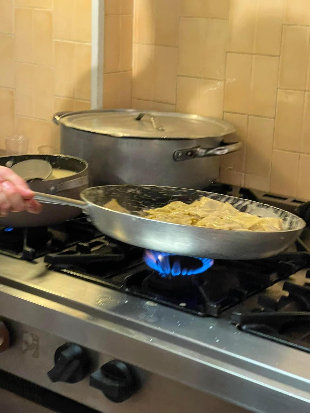 Ampia cucina industriale equipaggiata con pentole e quanto altro